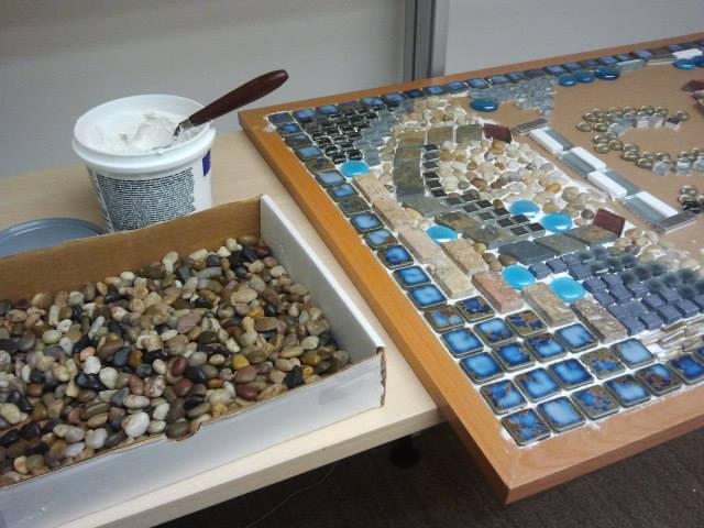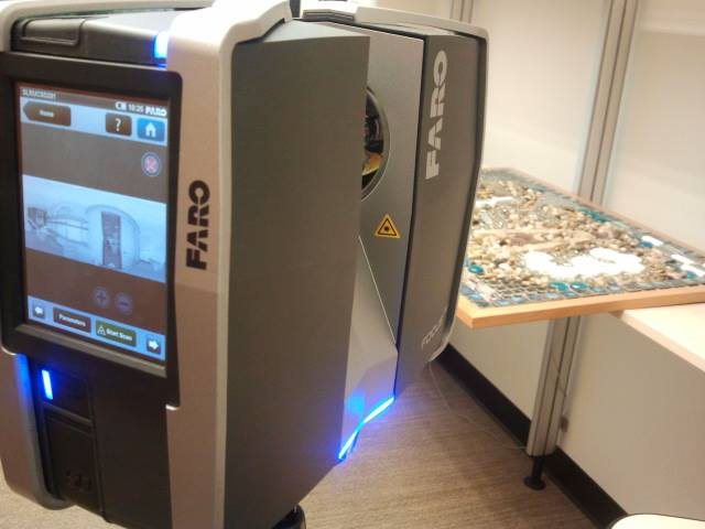 To investigate the resolution capacity and best methodology for close range terrestrial laser scanning of mosaics in the field (like the Byzantine mosaic floor we had previously scanned at Petra), I built a CISA3 mosaic out of different types of tiles (to also investigate refraction issues AND give Vid some fun textures to play with in his viz software). With the help of my mummy dearest who happened to be visiting during summer construction fun, we laid out the mosaic in sections, scanning in between additions and grouting to provide a time lapse data set to our colleague David Srour for our temporal point cloud visualization project that expanded out of Sandcastles for Science and was presented at Marseilles.