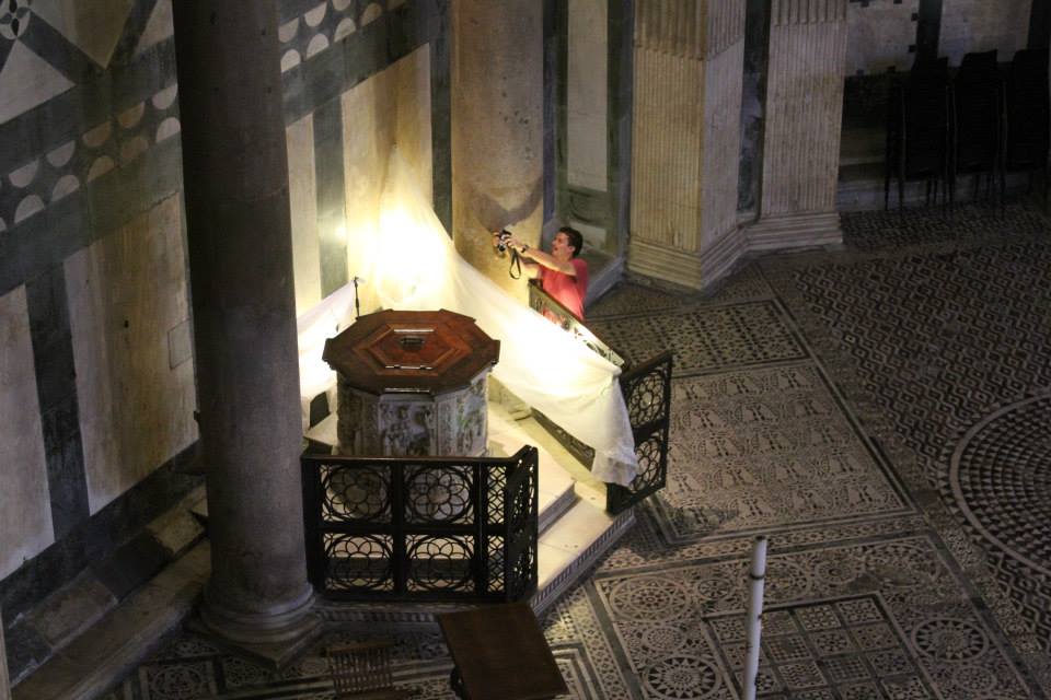 Vid was meanwhile in charge of digitizing the artifacts in the Baptistery selected by Maurizio and our wonderful art historian Katharina Giraldi-Haller for priority imaging. Juggling lighting rigs, camera equipment, and ever-mindful of my scanning, Mike Hess’s thermography, John Mangan’s metadata photography and filming, and all the rest: Vid imaged the Baptistery’s carved font (recently made even MORE famous by Dan Brown’s use of it in Inferno), and several of the sarcophagi and statues lining the walls.